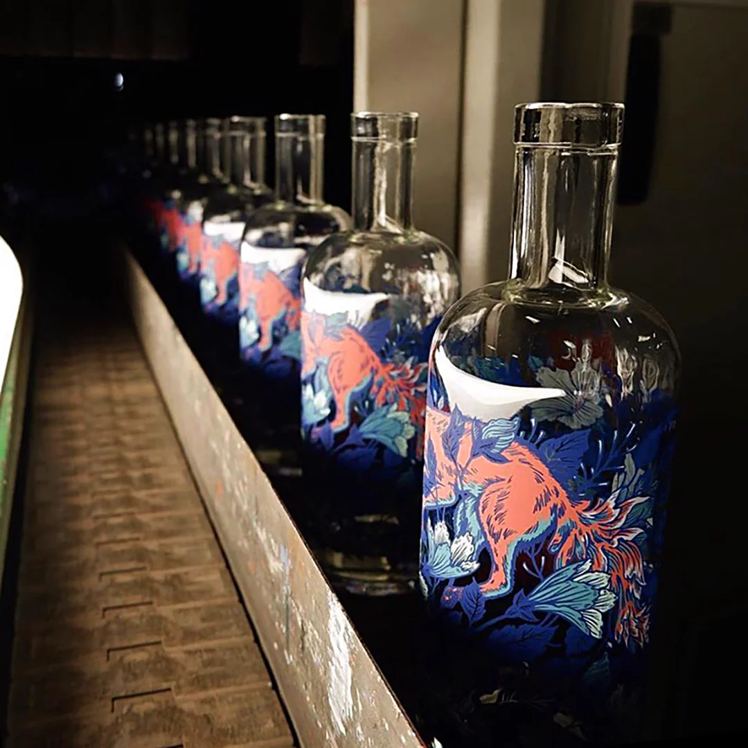 Illustration for a limited edition Rhubarb and Hibiscus gin label. The wrap-around design was created as a four color screen print that was printed directly on the bottle.