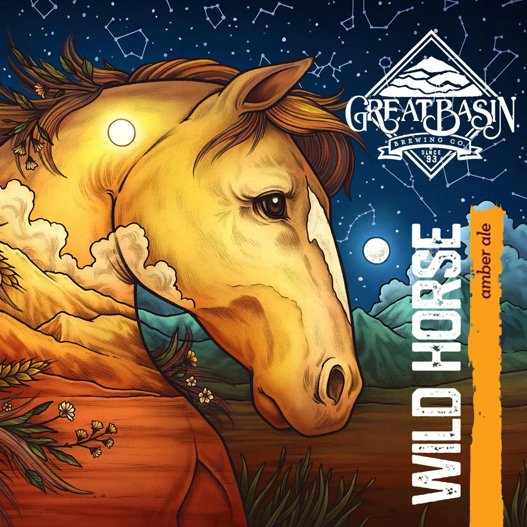 Illustration for Great Basin Brewing Co.’s beer, Wild Horse Amber Ale. This is a German-Style Brown ale that is inspired by the wild horses of Nevada, that roam free throughout the Piñon pine and sagebrush and embody the independent, adventurous, spirit of the open range.